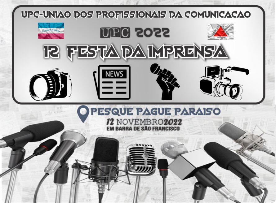 No próximo sábado 12 de novembro, ás 19H, todos os representantes da imprensa escrita, falada, televisada e de mídias eletrônicas, estarão se reunindo na “12ª Festa da Imprensa”. O encontro dessa vez terá início por volta das 19 horas, no Pesque Pague Paraiso, em Barra de São Francisco/ES., na região noroeste do Espírito Santo. Participam jornalistas, radialistas e comunicadores em geral do Norte e Noroeste do Espírito Santo e também do Leste de Minas Gerais.